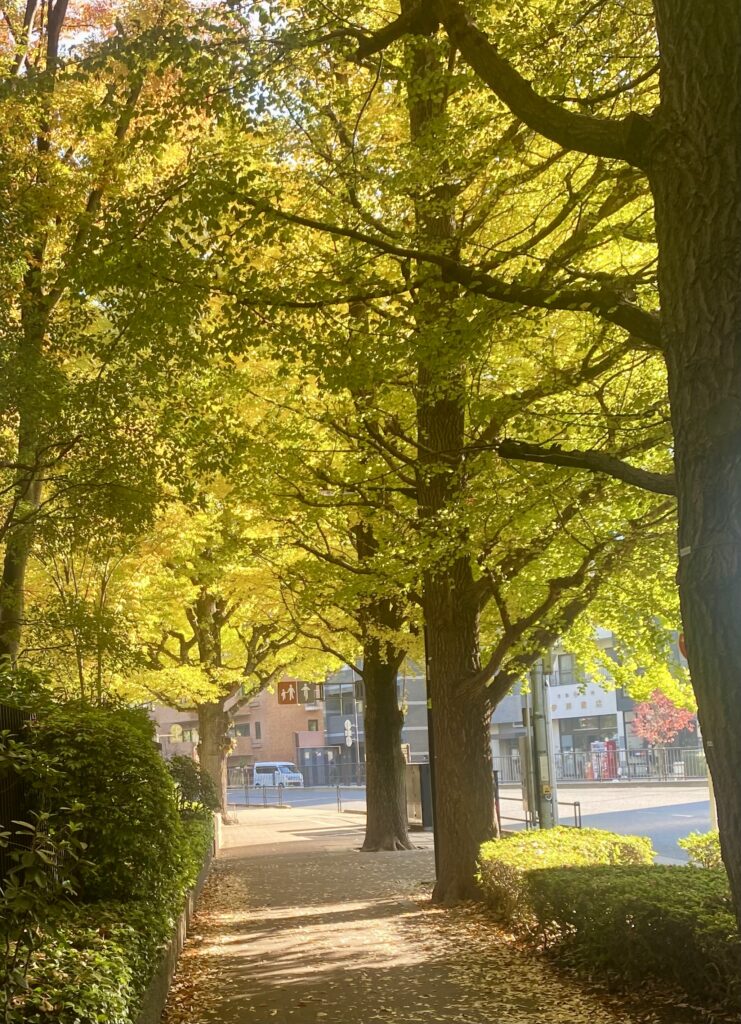 いつも歩く暗い木立のトンネルが、期間限定の眩い黄金色へと装いを替え、私たちを楽しませてくれます。