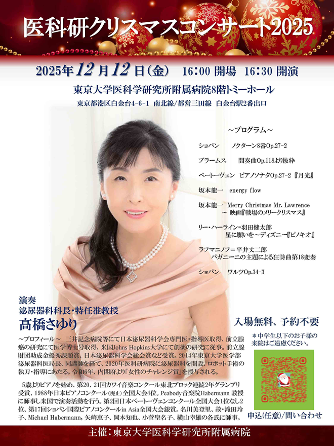 医科研病院泌尿器科科長の髙橋さゆり先生のピアノコンサートがこちら。